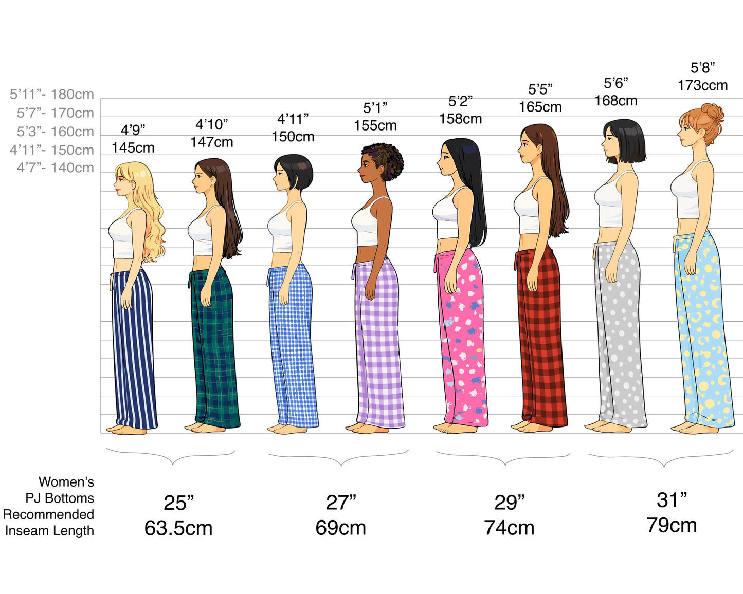 We make cute, comfy, colorful pyjama bottoms in 4 lengths for women height from 4’9” to 5’8” (145cm to 173cm)